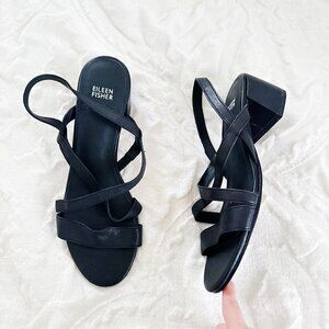Elegant black sandals with a block heel. Features a slingback strap and open toe design. Perfect for any occasion.