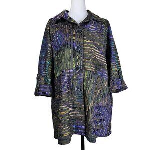 Eileen Fisher jacket, silk blend jacket, black jacket XL, jacquard wave pattern, designer jacket, women's blazer, evening wear, open front coat, long sleeve jacket, luxury jacket, stylish outerwear, premium clothing, formal jacket, luxury, old money, office, formal, silk, swing jacket, evening, lightweight