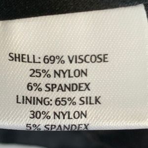 69% viscose/25% nylon/6% spandex. Great quality fabric. Dry clean only. Excellent condition!