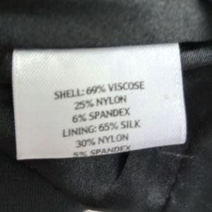 Material: (Shell): 69% viscose, 25% nylon, 6% spandex / (lining): 65% silk, 30% nylon, 5% spandex