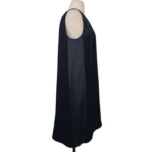 Eileen Fisher Black Velvet Tunic Top, v-neck, Rayon Silk Blend, Pullover, Sleeveless, contrasting silk side panels, Relaxed Flowy fit, Asymmetrical hem, lightweight.