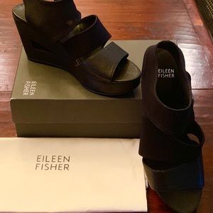 Good pre-owned condition. Size 9.5M approximately 3.5 “ wedges with a 1” platform (see photos) with leather and elastic straps. Comes in the Eileen Fisher box with dust bag.