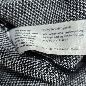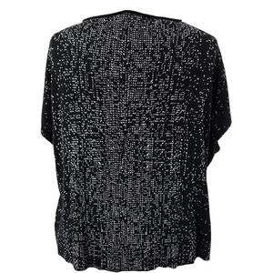 L/XL. Good used condition, with no stains or tears. A dressy black and white knit top, with a boxy, relaxed silhouette. Has a bateau neck and short sleeves.