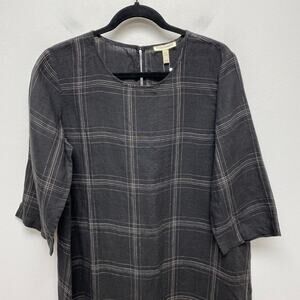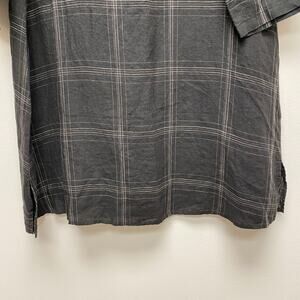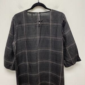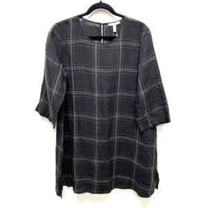 Eileen Fisher Black Windowpane Plaid Organic Linen Round Neck Side Slit Tunic M