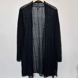Women’s size Medium Eileen Fisher solid black mesh sheer organic linen blend long sleeve swim cover-up or cardigan in excellent like new condition. No flaws, clean nonsmoking home. Approx 20” pit to pit across bust, 23” pit to lower hem side length.