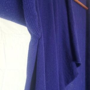 Eileen Fisher blue 100% merino wool cascade shawl neck open front cardigan. Ribbed sleeves. Excellent condition, one small snag on back, as shown in pictures. Size medium.