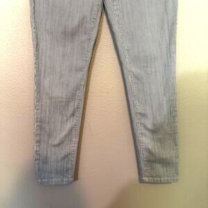 Slim railroad stripes pattern lightweight chambray skinny jeans with a touch of comfortable stretch. Mid-rise stretch denim. Slim fit.