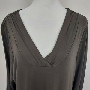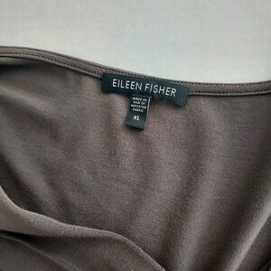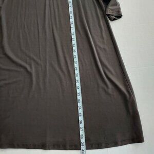 Elegant brown midi dress by Eileen Fisher. Features a V-neck and long sleeves. Perfect for versatile styling.