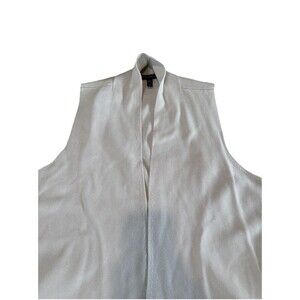 The vest is designed with an open front and sleeveless, making it easy to wear over other clothing items. It is a regular fit and comes in size medium. The vest's style is perfect for any occasion, whether it's for work or play. Add this Eileen Fisher vest to your collection today!