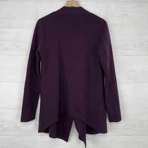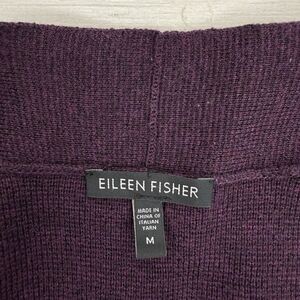 Eileen Fisher Women M Cardigan Purple Merino Wool Open Front Leather Trim Pocket