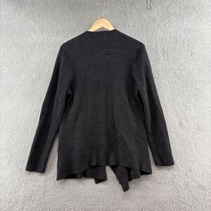 Really classy and comfortable cardigan - easy to throw on for a put together casual look Dark charcoal grey color throughout with black leather trim on front pockets Open front style without closures with waterfall draping Straight streamlined back silhouette