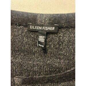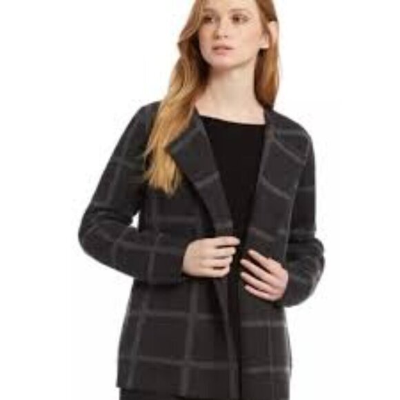 Eileen Fisher Caridgan Open Front Merino Wool Windowpane Plaid Grey Black