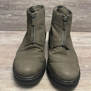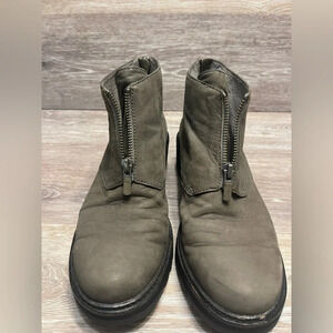 Eileen Fisher Casey Tumbled Nubuck Chukka Bootie in taupe leather with silver zippers in the front and back. Pre-owned condition with minimal wear. please see all photos for condition!