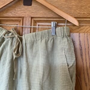 Eileen Fisher Checked Organic Linen Pants with an elastic waist - drawstring tie closure and pockets! Color is a beige/tan pant with maybe a slight greenish hue - depends on lighting. Neutral for sure. The pants have a slight tapered leg.