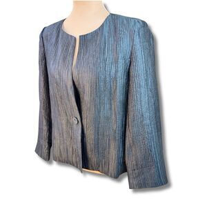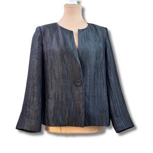 Eileen Fisher Crinkle Silk Collarless Jacket-Black-Leather Trim Pockets-Medium