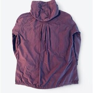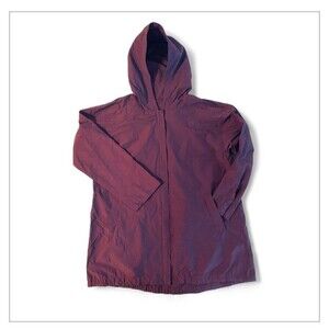 Gently used Eileen Fisher rain jacket, size Large. This raincoat is lightweight and unlined with a hood and a full front, 2-way zipper. Drawstring on inside hem to adjust the fit. The color is dark purple that looks burgundy in some lighting. I believe this color was called Cabernet.