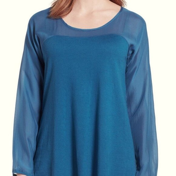 EILEEN FISHER DEEP SKY SCOOP NECK WOVEN CONTRASTTOP *NEW WITH TAGS****SIZE SMALL****ORIG $298.00!! ****WOVEN SILK YOKE AND SLEEVES*****LENGTH-APPROX 29.5"***** 70% COTTON, 20% NYLON, 10% SILK, TRIM 100% SILK