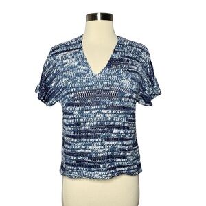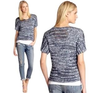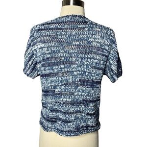 This Eileen Fisher short sleeve sweater features a denim-inspired brushstroke knit in soft shades of blue and white. Made in the USA from a breathable cotton-viscose blend, it has a relaxed boxy fit and a slightly sheer open weave — perfect for layering over tanks or tees.