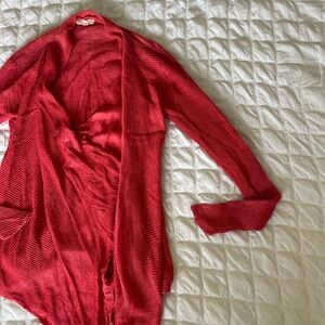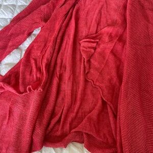 Elegant red cardigan with open front design. Soft and lightweight for versatile wear.