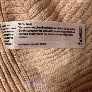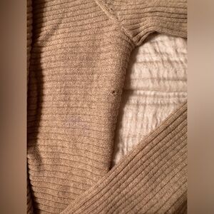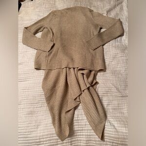 Cream color. 100% wool. Waterfall type front. Small hole below underarm (see photo)