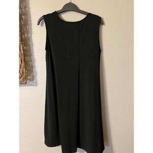 This pretty dress is from Eileen Fisher in a misses size extra small (XS/TP). Solid jet black in color. 92% viscose, 8% lycra spandex. Machine washable. Pullover style with stretch. Back center has a flat pleat. Ideal to layer.