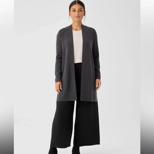 A best-selling shape set apart by refined texture. The high collar cardigan with long lines and dramatic side slits. Soft and luxurious in fine merino with regenerative fiber.