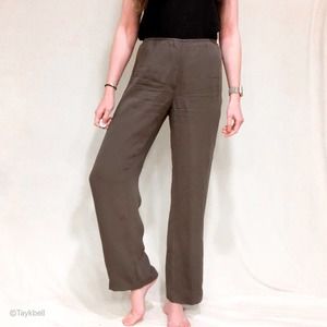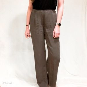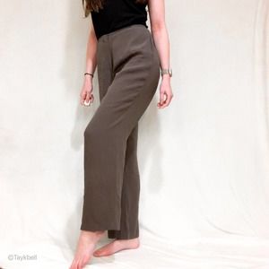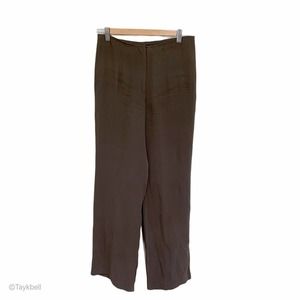 Excellent pre-owned condition, no visible flaws. Taupe color (in between a brown and gray). Zip front and metal slide closure. Wide leg kick flare cut, perfect to wear to work or any professional setting.