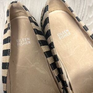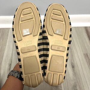New without Tags Women’s Eileen Fisher Black and Beige Tan Striped Burlap Slip On Driver Loafer Flats in Size 8.5