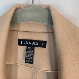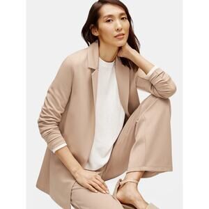 Eileen Fisher, women’s blazer, open front, long sleeve, neutral tan, beige, minimalist, classic, tailored, relaxed fit, lightweight, versatile, workwear, office jacket, career wear, sustainable fashion, timeless, sophisticated, elegant, layering piece, modern