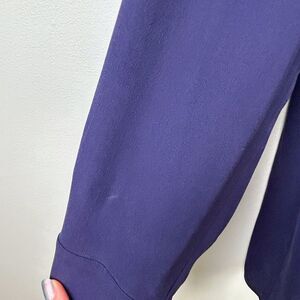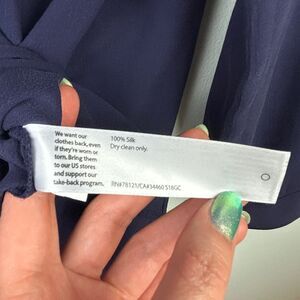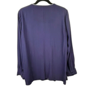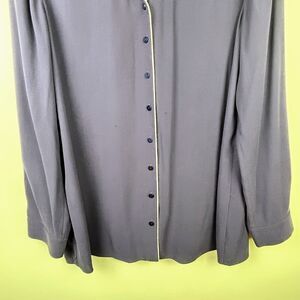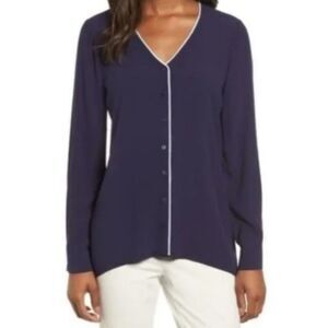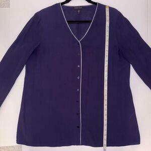Eileen Fisher 100% silk georgette crepe blouse in a blurple leaning navy blue shade with ivory colored piping detail at hems. This classic designer button down top features long sleeves with button cuffs, a drapey relaxed fit, and a classic collarless v neck. Perfect as a career top or dressed down with jeans. Women's size M medium, measurements pictured. Good used condition, small spots to front and faint white mark on arm shown in final photos.