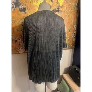 Here’s a dressy permanently, pleaded glittery tunic top from Eileen Fisher. This is stretchy and comfortable, lightweight, and perfect for a party or evening out. Super comfortable this is lightweight and Flowy. There are a few small flaws in the fabric here and there. One in the front, see the photo . I don’t find it to be too noticeable. Dry clean only.