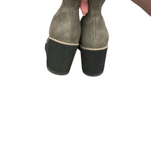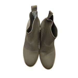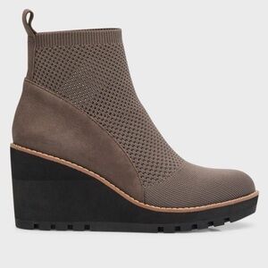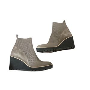 These Eileen Fisher wedge ankle boots are where function meets fashion. With a sleek taupe knit and suede upper, they mold to your foot for a custom fit—no zippers, no hassle. The lightweight wedge sole gives you a lift without sacrificing comfort, and the grippy lug outsole means you’re ready for any season.