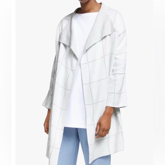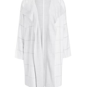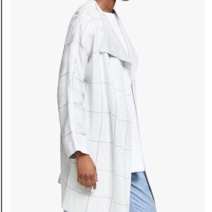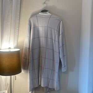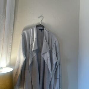 Stylish gray plaid cardigan. Open front design. Perfect for layering.