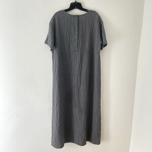 Elegant gray textured midi-maxi dress by Eileen Fisher, featuring a soft, structured silhouette and minimalist design. Crafted from a lightweight linen-rayon blend with a subtle check texture, this piece is perfect for lagenlook and soft grunge styling.