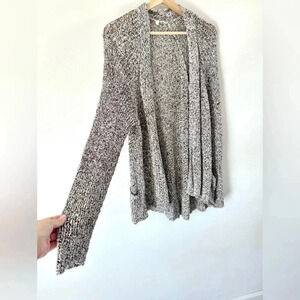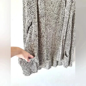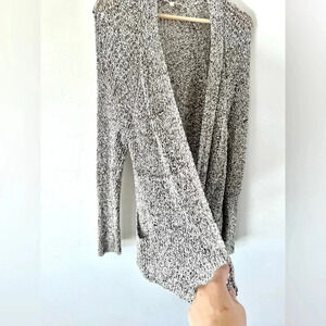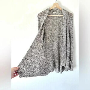 Eileen Fisher Grey & White Open Knit Drape Front Long Line Cotton Cardigan Sweater