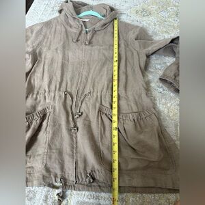 Eileen Fisher Hooded Irish Linen Jacket. Zip up at front. Drawstring waist for a more fitted look. Size tag missing, fits like an XL, please see measurements. Good condition.