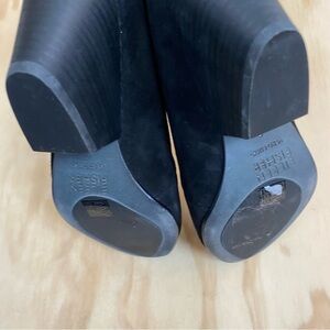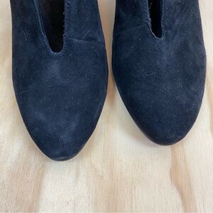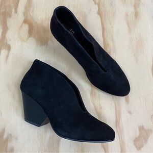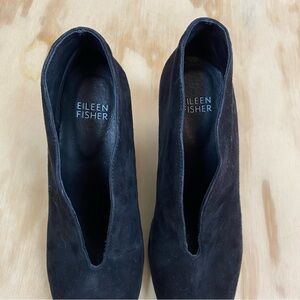 Deep slits and smooth curves elongate the leg in this minimal-cool design by Eileen Fisher. Almond toe; slip on; deep V detail at instep; 3" cutout wedge heel. Suede upper, leather lining, rubber and leather sole. Very good preowned condition.