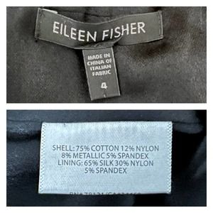 Size 4. This black ruched Italian cotton glitter cocktail dress is your new wardrobe favorite! Scoop neck, empire waist, bra-friendly straps, sleeveless, hidden back zip, tasteful metallic glittery sheen in the light. Eileen Fisher cotton steel stretch shirred tucked dress. Shaped with tucks that acquire a textural life of their own, in satin-woven cotton with finely spun threads of steel. Shell fabric: cotton / nylon /metal / spandex. Lining: silk/nylon/spandex. MSRP $328.00.