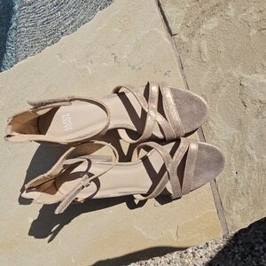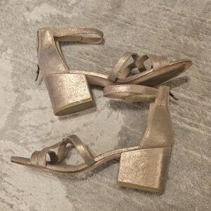 Eileen Fisher Jazzy Heel Sandals Gold Platinum Leather Block Strap