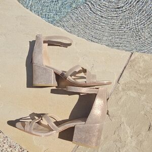 A metallic finish shines on a nubuck crisscross strap sandal that is elevated by a trendy block heel.