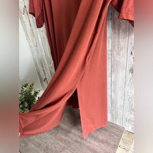 This is so soft and comfortable. Tunic style so longer and has slits on the outside for style and comfort. Boat neck. The color is a rust red/orange
