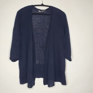 Eileen Fisher LINEN Open Front Cardigan Size L Navy 3/4 Sleeve Sweater Casual