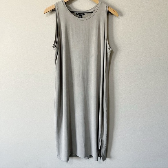 Eileen Fisher sleeveless tank dress in a light gray. Size medium. Cupro blend. Midi length. Side slit. Round neckline. Pre-owned, excellent used condition- writing on interior care tag.