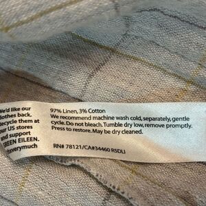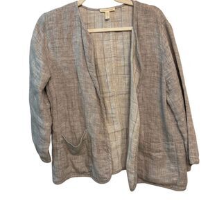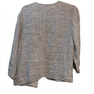 This is a preowned Eileen Fisher Linen Cotton Open Front 3/4 Sleeve Blazer. Made from a blend of organic linen and cotton, offering a lightweight and breathable feel, suitable for various seasons. It features an open-front style, often with a relaxed fit and 3/4 length sleeves, reflecting Eileen Fisher's minimalist aesthetic. It could be worn as a lightweight jacket or a relaxed blazer, suitable for both casual and layered outfits in a Lagenlook style. The blazer is a woven linen and the color varies in the weave. I included uplcose images of how this variation looks. There is one small square where the change in linen thread is more noticeable than other areas but overall this gives the blazer that minimalist natural look.