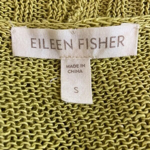 Eileen Fisher Linen Blend 3/4 Sleeve Open Knit Cardigan in Chartreuse - Small. Excellent pre-owned, like new condition. Linen, cotton, nylon and rayon blend. Open knit, 3/4 sleeve, open front. Approximate measurements: 18 1/2" bust, 26" length.