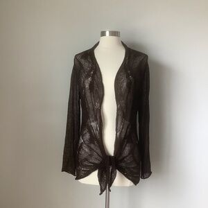 Stunning Eileen Fisher Linen Blend Lace Open Front Long Sleeve Draped Cardigan Sweater. Mussel brown color. 60% Rayon, 27% Linen, 13% Nylon.  Size Small.  Great pre-owned condition, no flaws.  MSRP$168
