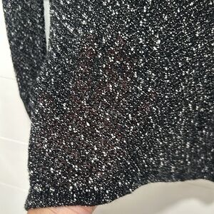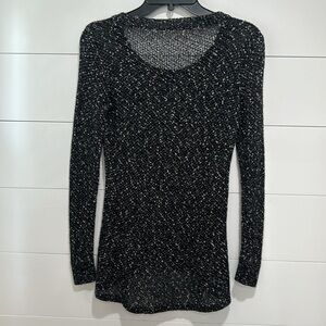 Black speckled long sleeve with a net like knit texture. Semi sheer, would require a tank top or appropriate undergarment.