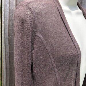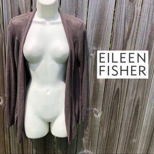 Brown knit cardigan from Eileen Fisher. Features full length sleeves, and open front. Size PP/PTP, equivalent to a 2/4P, or XSP. 75% linen, 25% nylon. Hand was cold. Excellent condition.