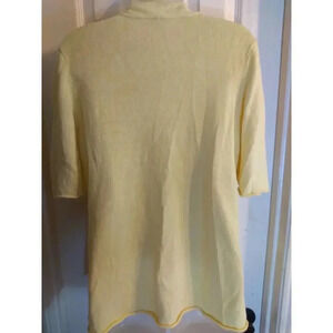 This Eileen Fisher cardigan is a must-have for any wardrobe, with its beautiful yellow color and tight-knit linen fabric. The short sleeves and open neckline make it perfect for any occasion, whether it's a casual day out or a business meeting. The cardigan is petite in size, with a PL bust of 38 and a length of 26 inches.