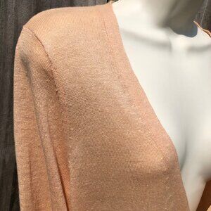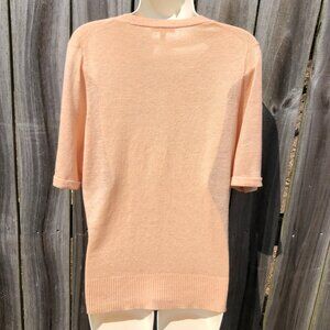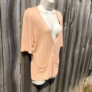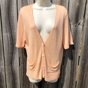 EILEEN FISHER cardigan. Peach/light orange color. Features a v-neckline and button front. Pointelle detail throughout. Ribbed trim. Short sleeves. Two front pockets. 70% Linen, 30% Silk. Hand wash cold. Excellent condition. Size medium.